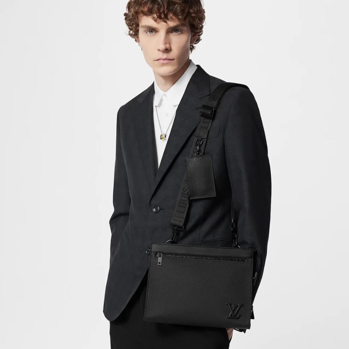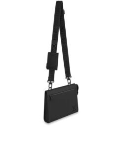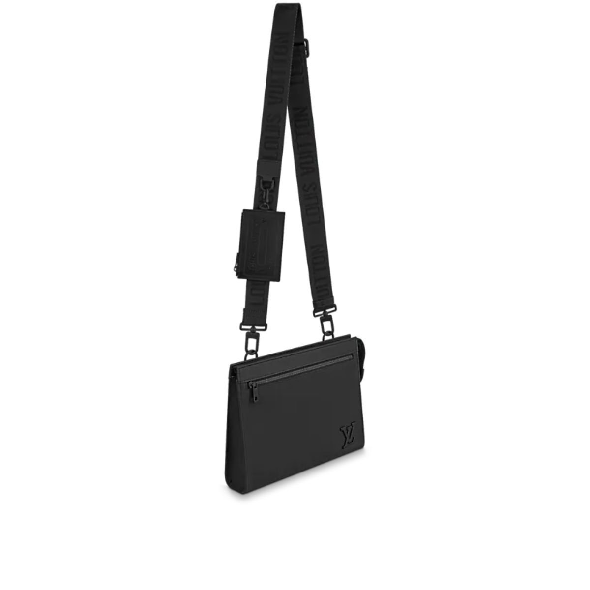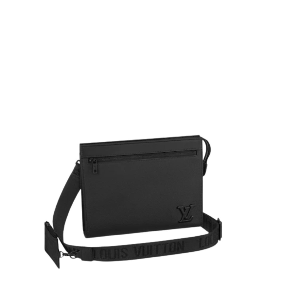 The new Messenger Voyage was inspired by Louis Vuitton?s bestselling Pochette Voyage, updated in keeping with today?s modular trend. Refined black Aerogram is enhanced with a signature strap and a metal ?LV? monogram. Its slim design is brimming with user-friendly details, like the removable tag on the strap that doubles as a card holder for easy contactless payment.